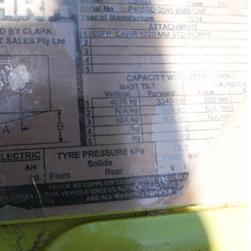Clark 5000kg capacity diesel forklift with 3 stage mast, sideshift, fork positioner, & fire extinguisher