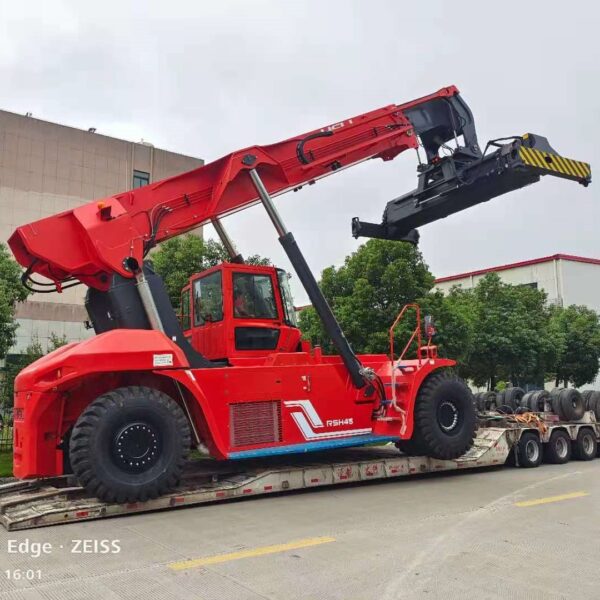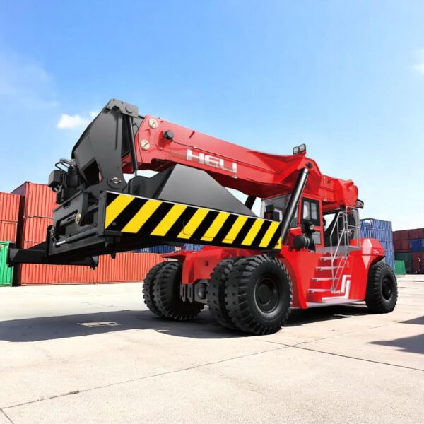 The Heli 45-ton reach stacker is a robust, high-capacity machine designed for efficient container handling in ports and terminals. Powered by a Volvo diesel engine meeting EU Stage IIIA emissions, it features a 45-ton lifting capacity, advanced hydraulic systems, and a Kessler drive axle for reliable performance in demanding conditions. Designed to exceed Australian port machinery standards, it ensures safety and compliance with EN1459 and ISO15018. The ergonomic cabin offers adjustable seating, intuitive controls, and excellent visibility, while the proven ZF transmission and ELME spreader enable precise, efficient container stacking up to 5 layers high