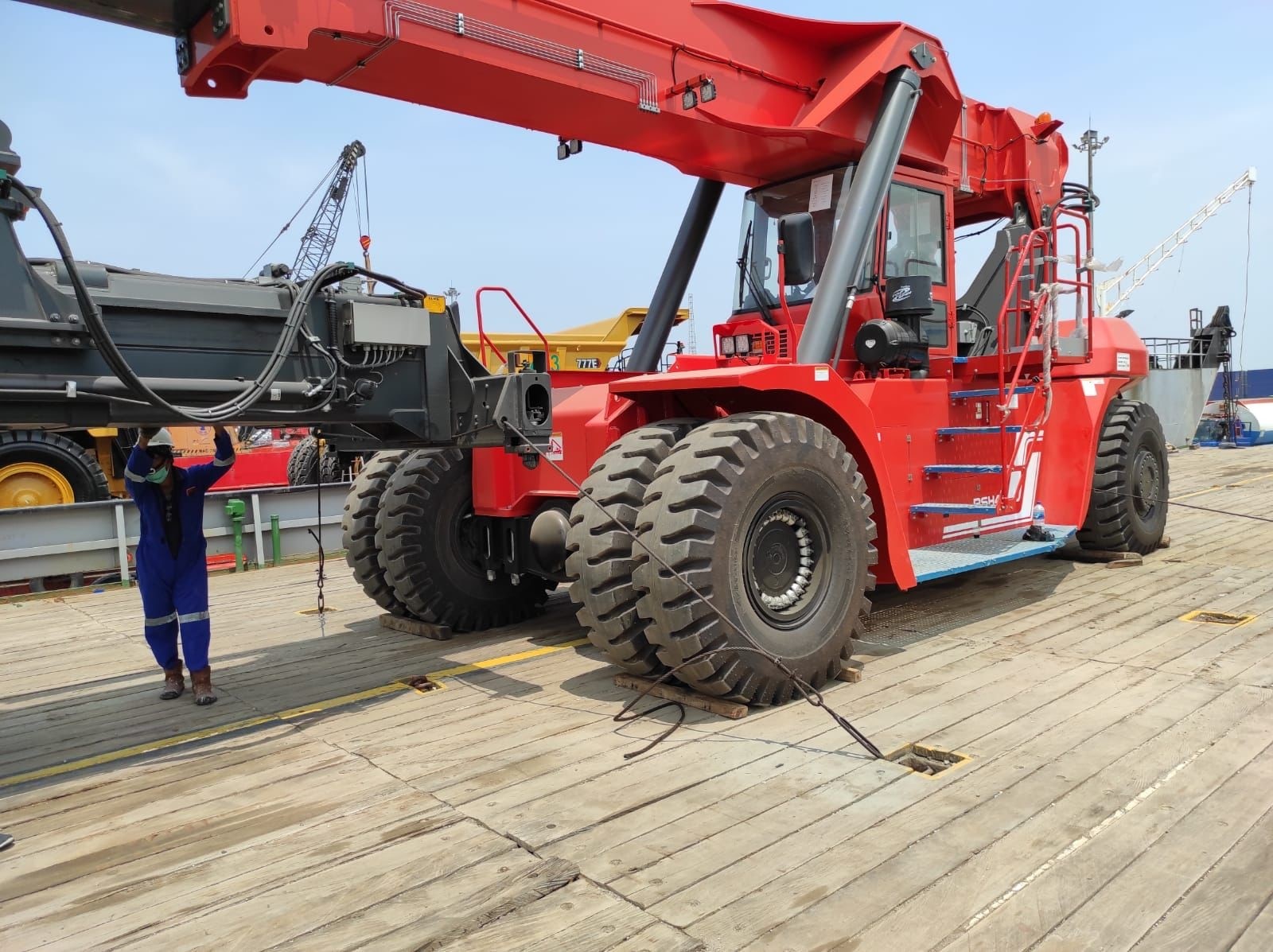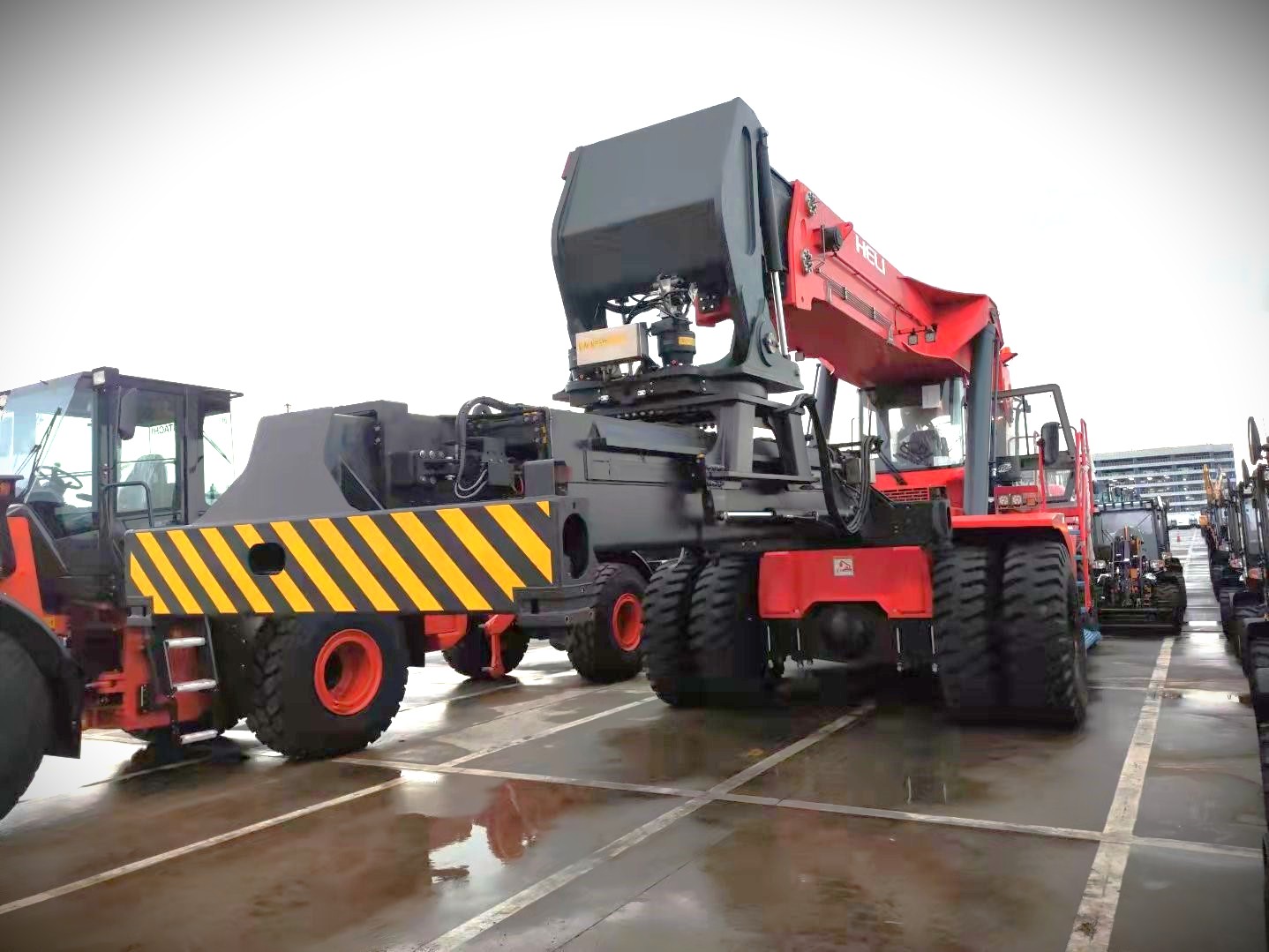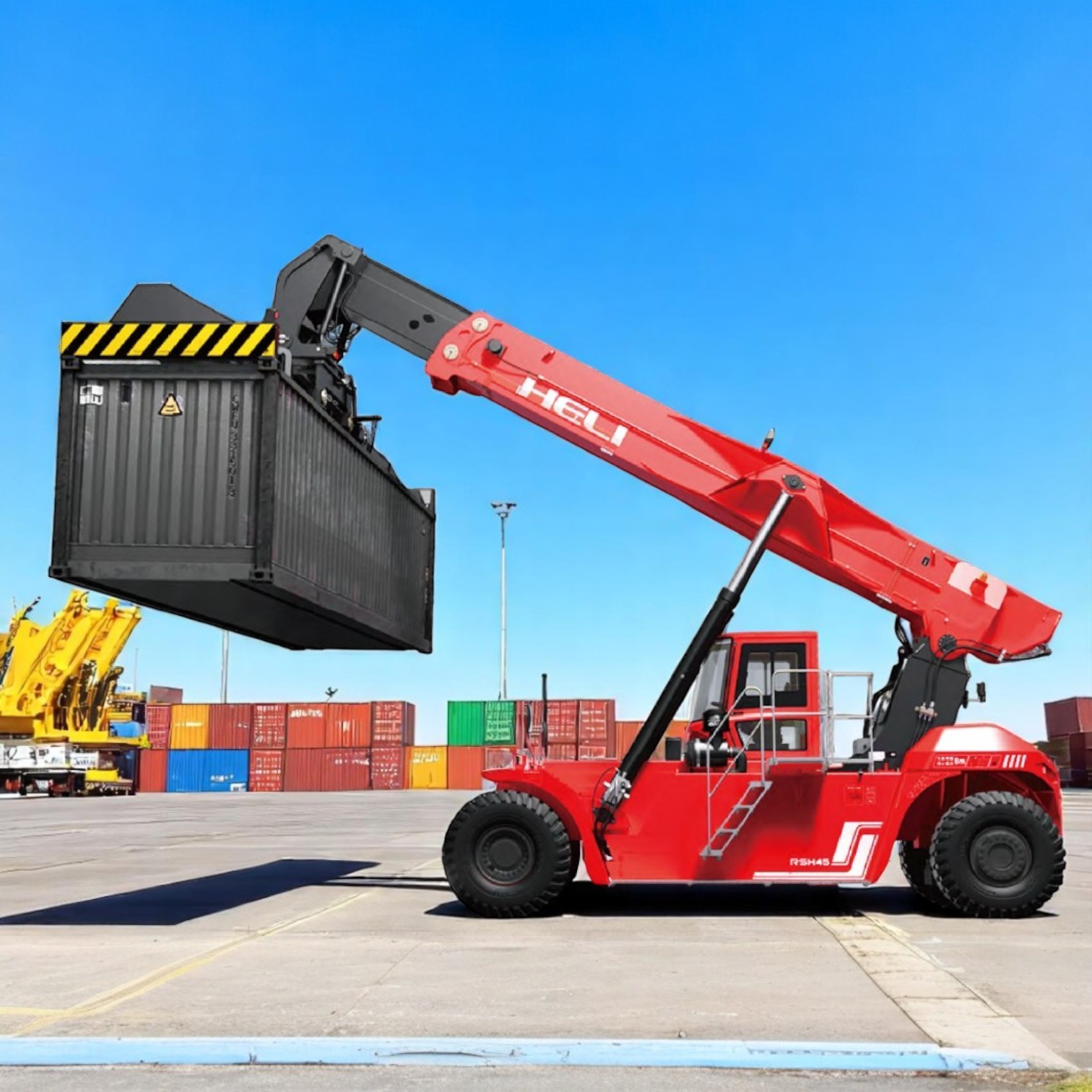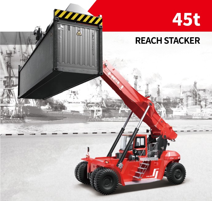 The Heli 45-ton reach stacker is a robust, high-capacity machine designed for efficient container handling in ports and terminals. Powered by a Volvo diesel engine meeting EU Stage IIIA emissions, it features a 45-ton lifting capacity, advanced hydraulic systems, and a Kessler drive axle for reliable performance in demanding conditions. Designed to exceed Australian port machinery standards, it ensures safety and compliance with EN1459 and ISO15018. The ergonomic cabin offers adjustable seating, intuitive controls, and excellent visibility, while the proven ZF transmission and ELME spreader enable precise, efficient container stacking up to 5 layers high